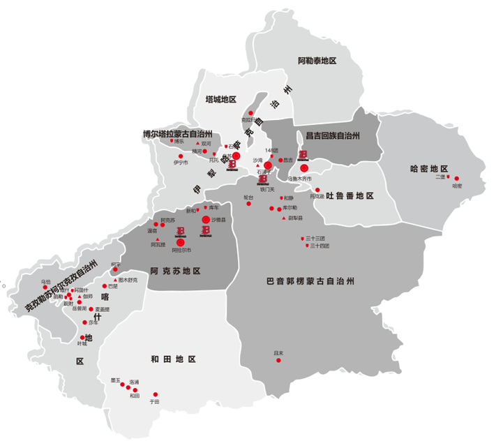 四个工作基底:乌苏、兰州、沙雅、阿拉尔、石河子 4S店(连锁店):尉犁、双河、阿瓦提、喀什、沙湾、图木舒克、伽师。 经售商(加盟商) 售后维修客服服务的性客户服务的中心:售后维修客服服务的性客户服务的中心:博乐、托托、石桥、乌苏、沙湾、122团、148团、石河子、呼图壁、新湖、西宁、二堡、库尔勒、尉犁、且末、轮台、策大雅、33团、34团、库车、新和、沙雅、阿拉尔、阿瓦提、阿克苏、二团、哈拉塔、图木舒克、巴楚、麦盖提、岳普湖、伽师总场、莎车、叶城、阿克喀什。
